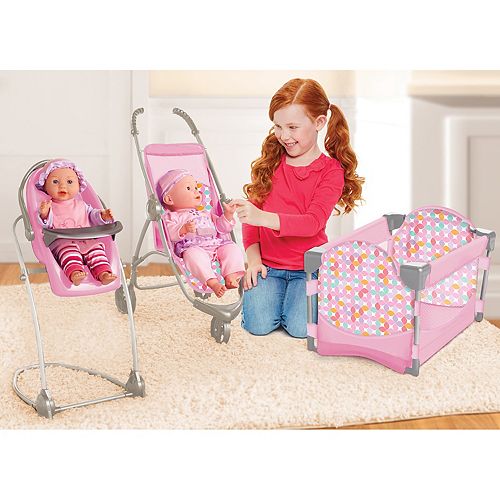 - Buckle dollie into the stroller, or pull out the pack 'n play with two ways to play
